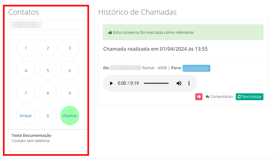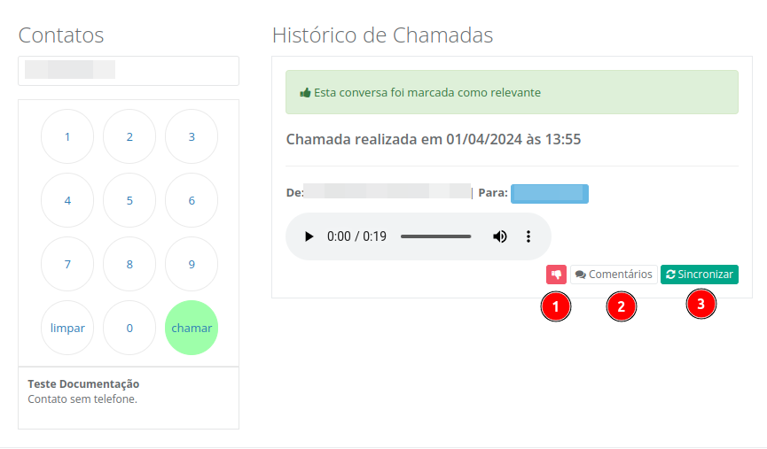 Se necessário, é possível marcar como relevante/irrelevante (1), adicionar comentários (2) ou sincronizar (3) o arquivo de áudio da ligação, para que seja possível escutá-lo em um player ao lado, clicando nos botões sinalizados abaixo.