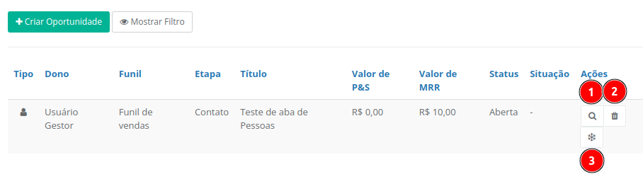 3. Ainda, na coluna ações, é possível ver detalhes (1), enviar para a lixeira (2) ou congelar (3) a oportunidade.
