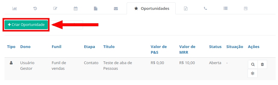 Na aba oportunidades é possível visualizar um resumo das oportunidades vinculadas à pessoa. São exibidas colunas contendo informações como tipo, dono, funil, etapa, título, valor de P&S, valor de MRR, status e situação.