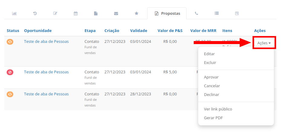 Na aba propostas é possível visualizar todas as propostas de oportunidades vinculadas à pessoa. São exibidas colunas contendo informações de status, oportunidade, etapa, criação, validade, valor de P&S, valor de MRR e itens.