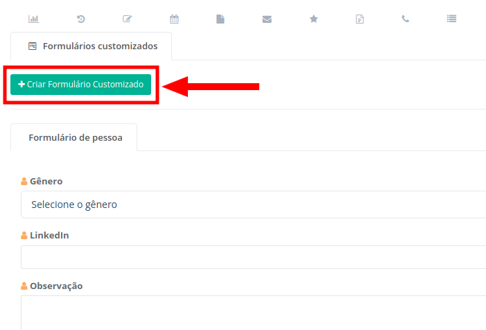 1. Por fim, a aba formulários customizados exibe todos os formulários customizados vinculados à pessoa. Para criar um novo formulário customizado, clique em "+ Criar Formulário Customizado".