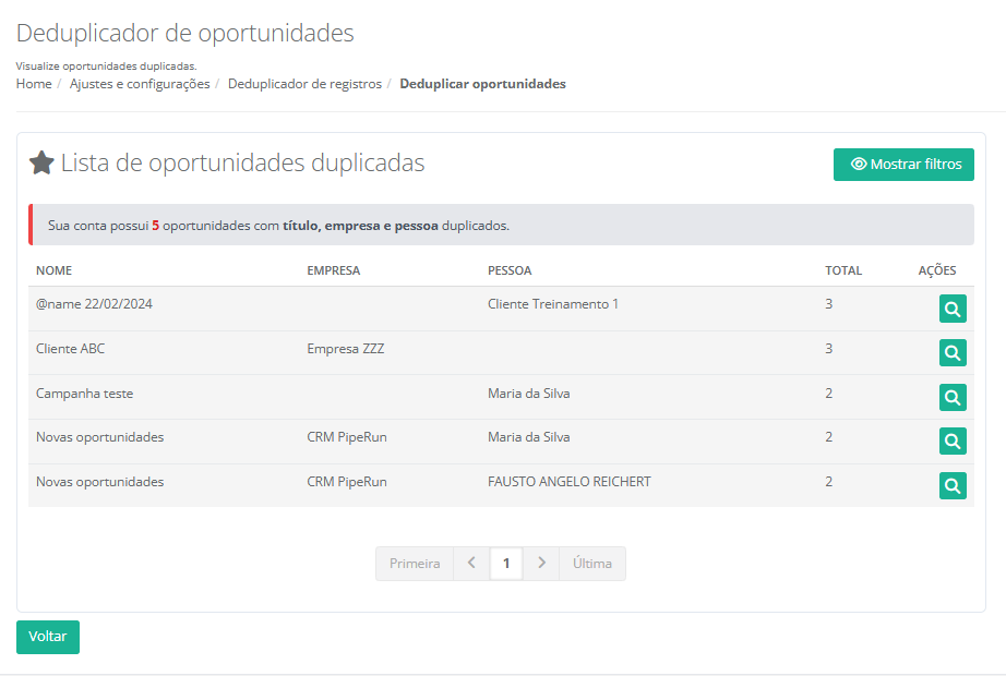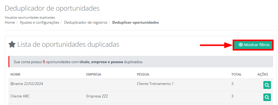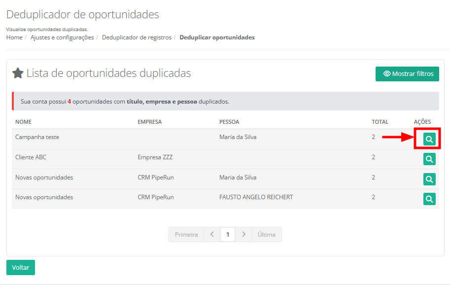 8. Será exibido em tela todos os registros de oportunidades duplicadas. Na coluna Ações, clique no ícone da lupa para visualizar as opções de deduplicação para a oportunidade escolhida.