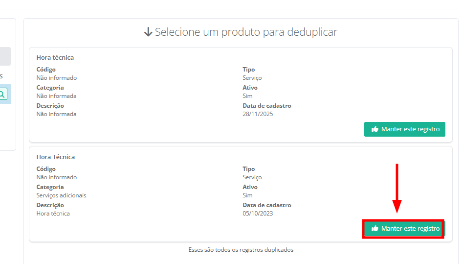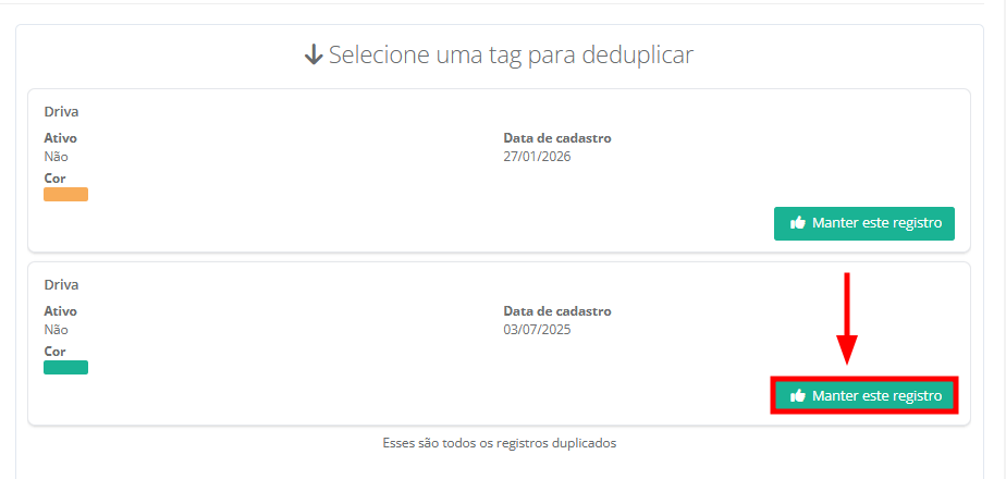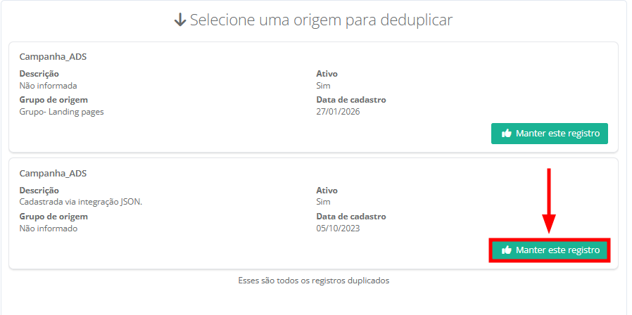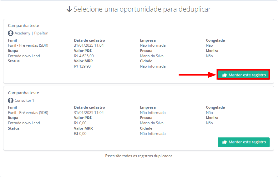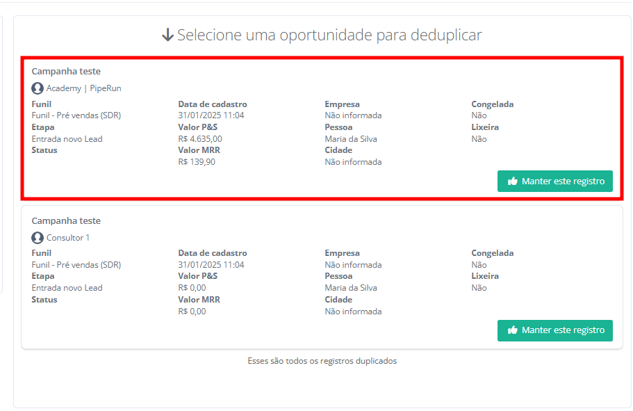 7. Ao lado direito da tela será exibido os detalhes de cada um dos registros duplicados. Você deverá escolher um registro de contato para manter. Clique em "Desejo manter esse registro" para remover a duplicidade.