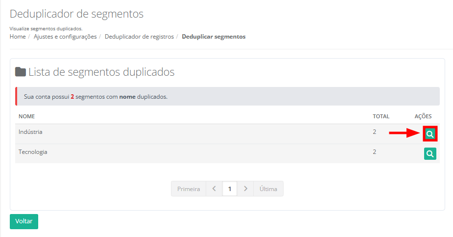 6. Serão exibidos em tela todos os registros de contatos duplicados. Na coluna Ações, clique no ícone da lupa para visualizar as opções de deduplicação para o Segmento escolhido.