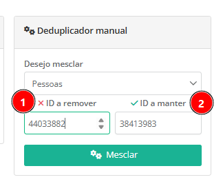 Você precisará somente do ID (número de identificação) do cadastro que deseja mesclar. O deduplicador manual poderá ser utilizado também para Pessoas, Empresas, Oportunidades, Origem, Motivos de perda e Produtos.
