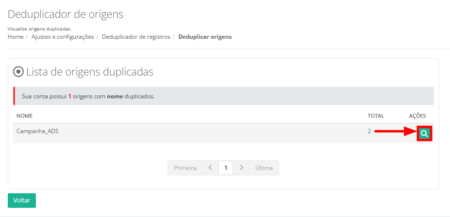 6. Será exibido em tela todos os registros de contatos duplicados. Na coluna Ações, clique no ícone da lupa para visualizar as opções de deduplicação para a origem selecionada.