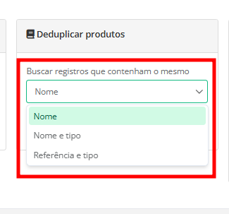 4. Selecione o critério pelo qual o sistema fará uma busca para encontrar eventuais duplicidades. As opções de critérios de duplicidades são "nome", "nome e tipo" e "referência e tipo".