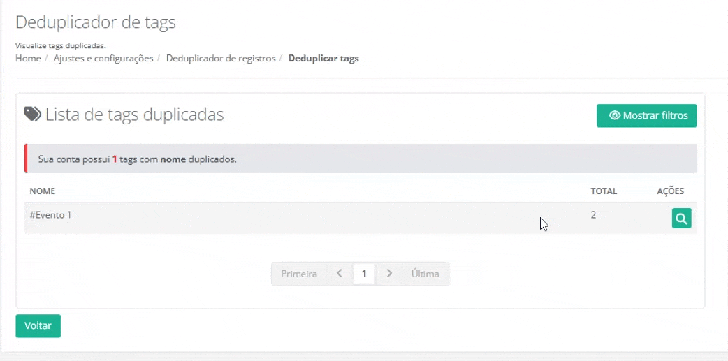 6. Para visualizar registros duplicados, clique em "Mostrar filtros" e selecione a entidade desejada (Empresas, Pessoas ou Oportunidades) e a seguir clique em "Filtrar tags".
