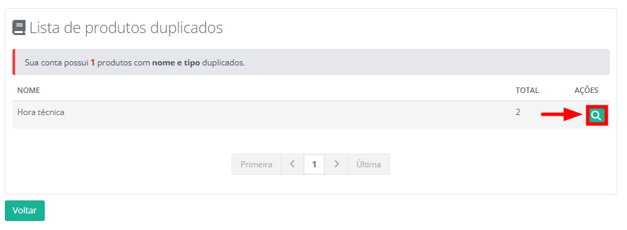 6. Será exibido em tela todos os registros de contatos duplicados. Na coluna "Ações", clique no ícone da lupa para visualizar as opções de deduplicação do produto.