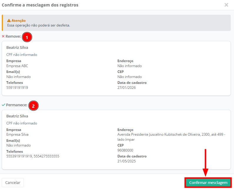 6. Será exibido em tela as informações do cadastro que será removido na parte superior é possível identificar os dados do cadastro que será removido (1) e abaixo, o que permanecerá (2). Após conferir os dados, clique em "Confirmar".