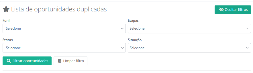 Dica: se nenhum filtro for selecionado a busca irá pesquisar oportunidades em todos funis e etapas com qualquer status ou situação.