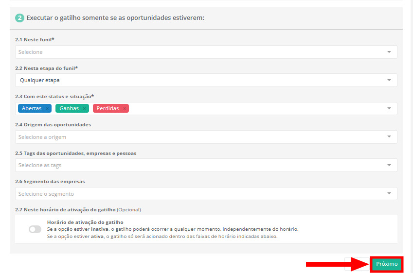 5. Na segunda etapa das configurações será necessário definir quais as condições das oportunidades para que a ação seja disparada.