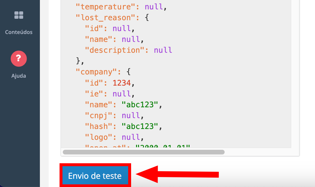 8. Na área "JSON Disponível" você poderá visualizar a estrutura padrão do JSON enviado via ação automática.