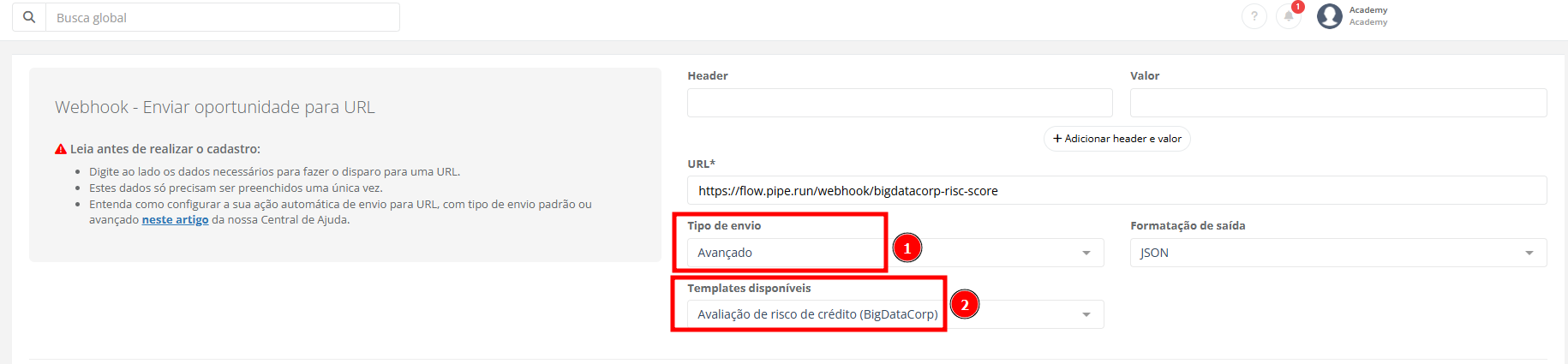 6. Em "Tipo de envio" (1), selecione como "Avançado", e em "Templates disponíveis" (2) selecione "Avaliação de risco de crédito (BigDataCorp)".