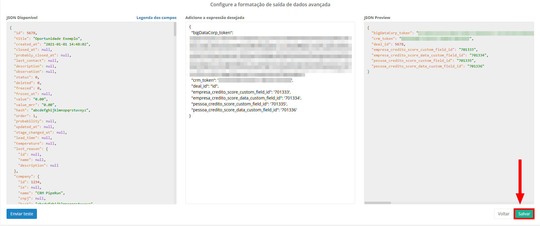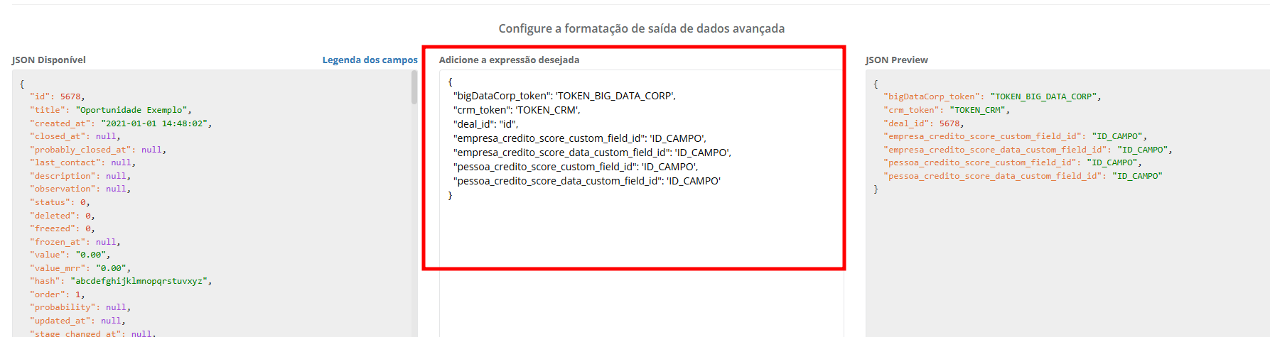 O campo "deal_id" não precisa ser alterado, pois ele será preenchido de forma automática com o ID da oportunidade que conterá as informações da análise de risco de crédito.