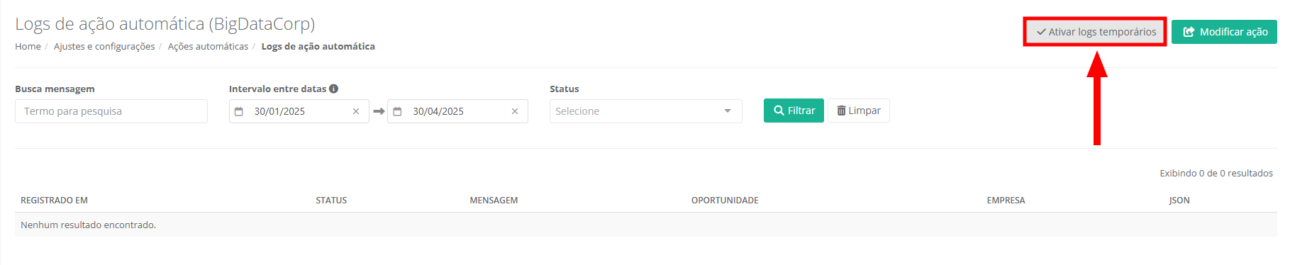 Dica: é possível ativar os logs temporários da ação automática para acompanhá-la. Para isto, clique nos logs na listagem de ações automáticas e, após em "Logs temporários". Os logs serão mantidos por 24 horas (após esse período, serão excluídos).