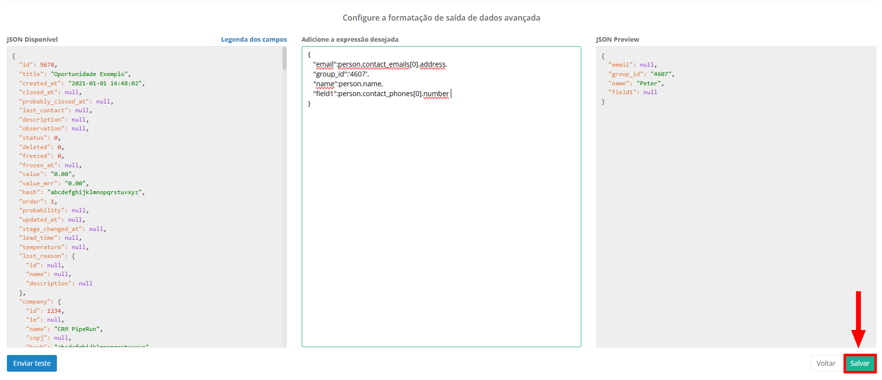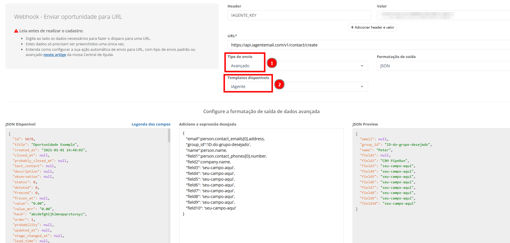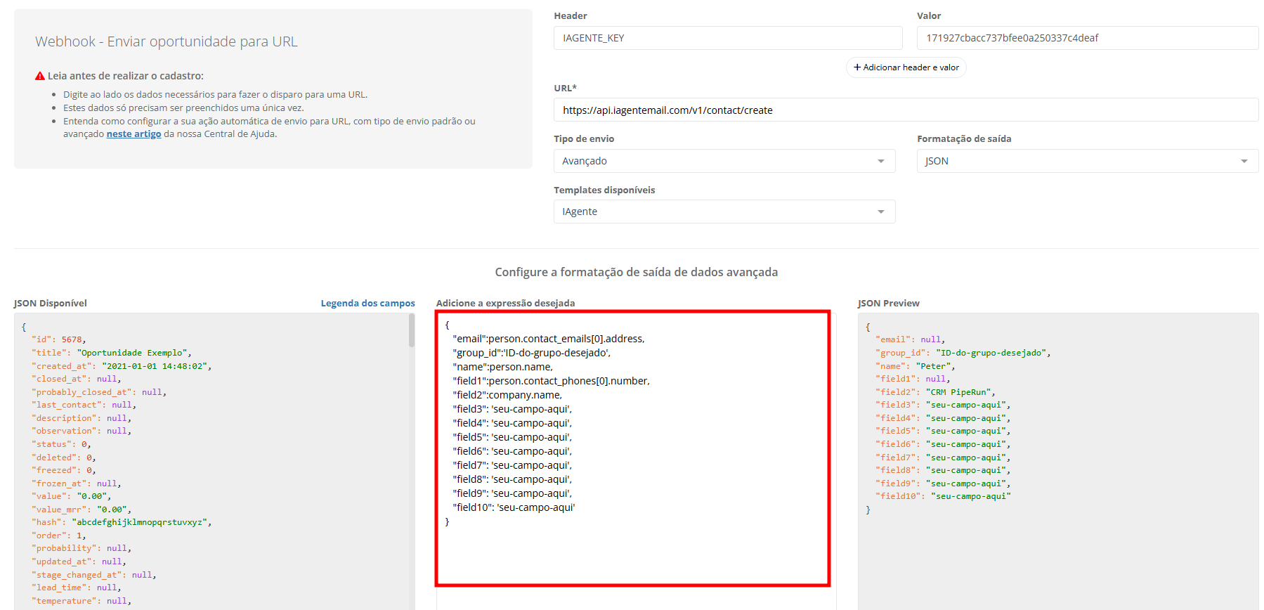 "email":person.contact_emails[0].address, // campo nativo do CRM que contém o e-mail de contato da pessoa "group_id":'ID-do-grupo-desejado', // informe o ID da lista que foi copiado no tópico um deste artigo. "name":person.name, // campo nativo do CRM que contém o nome da pessoa}Os campos "field1" até o "field10" são de preenchimento opcional e se enviados irão preencher campos customizados da lista de contato do IAGente. Caso não deseje enviar alguma informação você pode apagar estes campos do JSON.