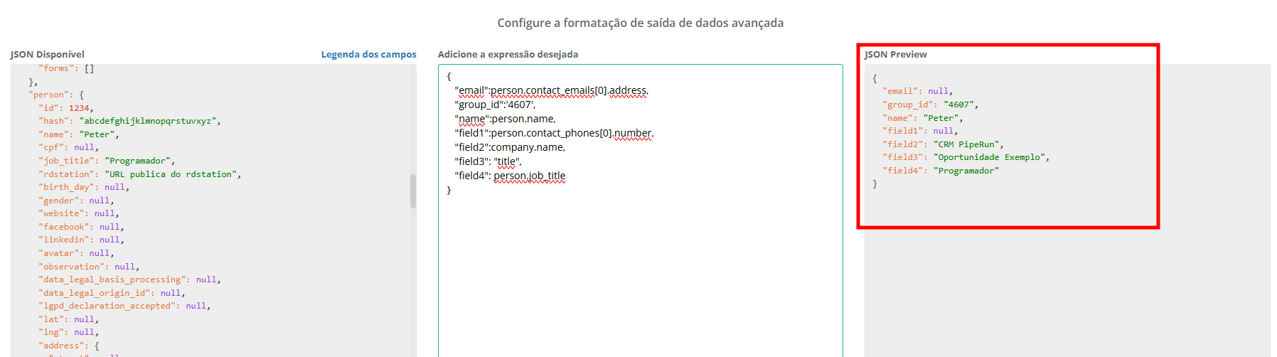 11. Agora, confira a pré-visualização da formatação do JSON de saída, na área direita da tela.