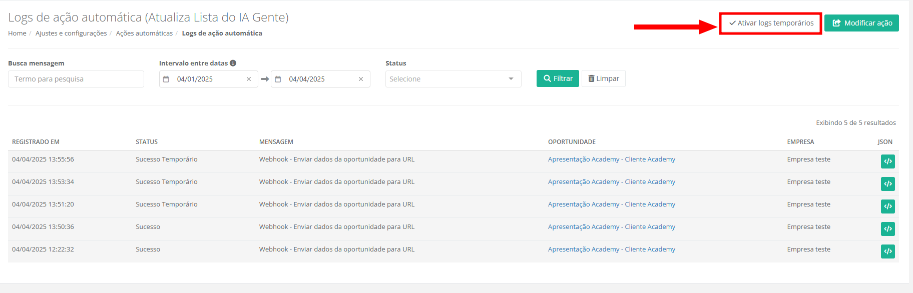 Dica: é possível ativar os logs temporários da ação automática. Para isto, clique nos logs na listagem de ações automáticas e, após em "Logs temporários". Os logs serão mantidos por 24 horas (após esse período, serão excluídos).