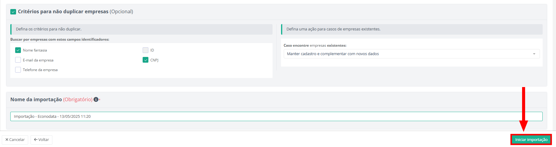 Realizar o enriquecimento de dados a partir do CNPJ cadastrado: marque esta opção caso tenha informado o CNPJ da empresa na planilha de importação;