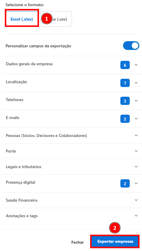 Dica: antes de realizar a exportação, é possível personalizar quais campos serão exportados para o arquivo que será gerado. Selecione os campos que são do seu interesse.