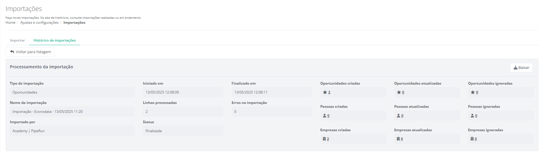 2. Ao final da importação você poderá acompanhar um resumo dos dados que foram importados.