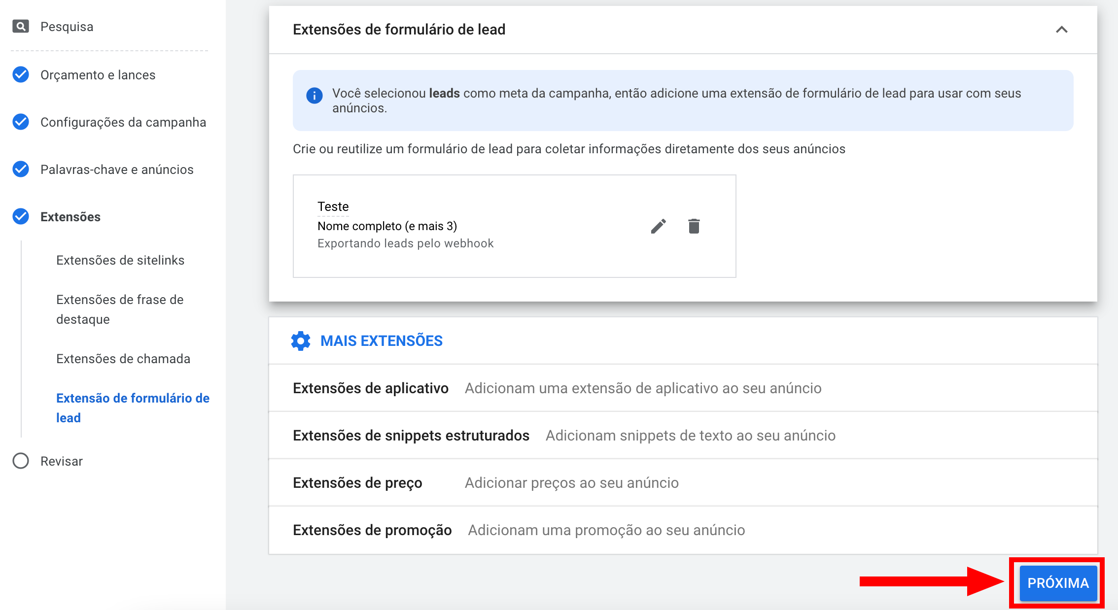 6. Ao retornar para a tela de configuração do anúncio, clique em Próxima.