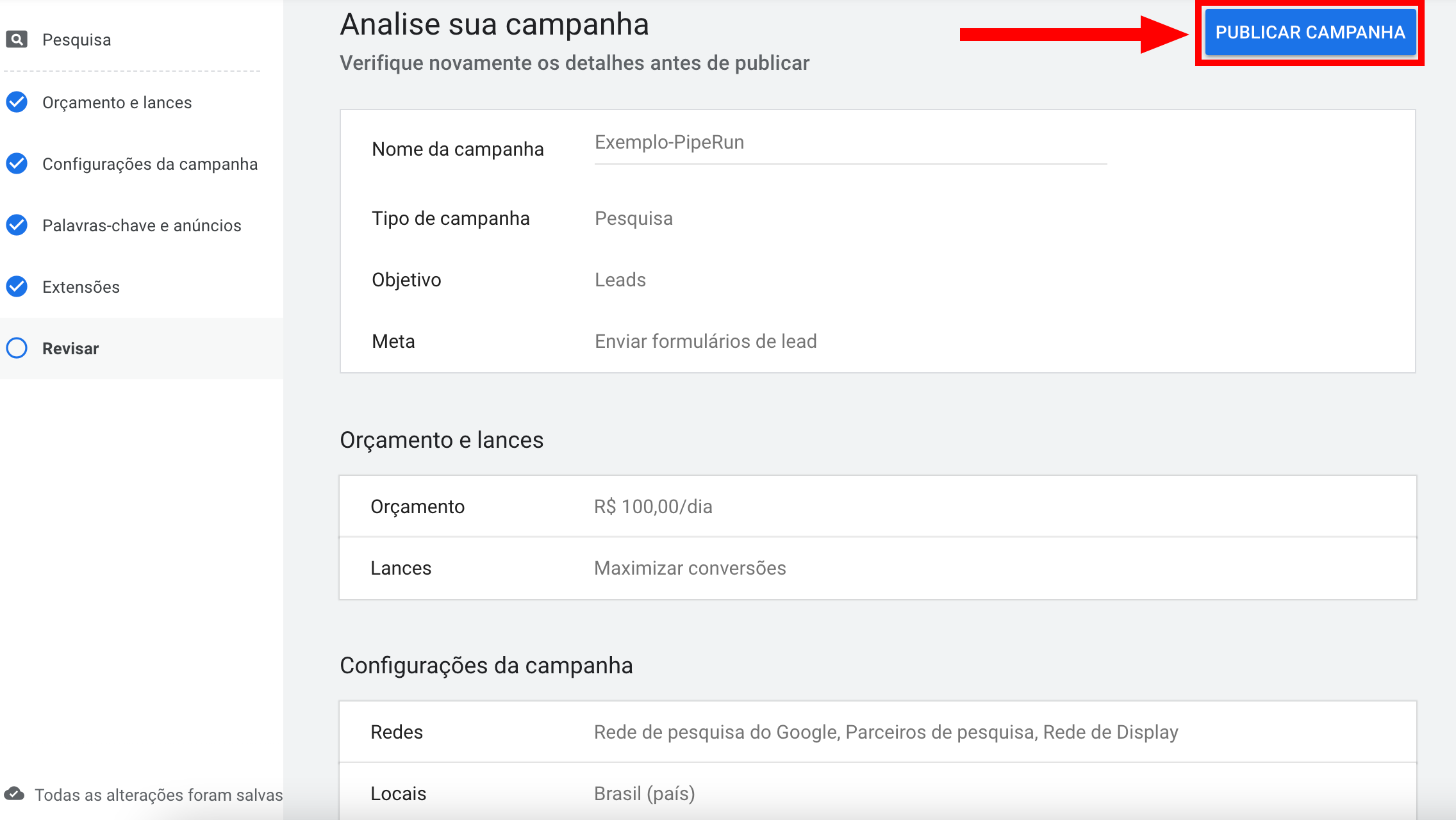 7. Agora que toda a campanha está montada, faça uma revisão e verifique se está tudo configurado corretamente. Caso esteja, clique em Publicar campanha e retorne para a aba da configuração da integração da Pluga.