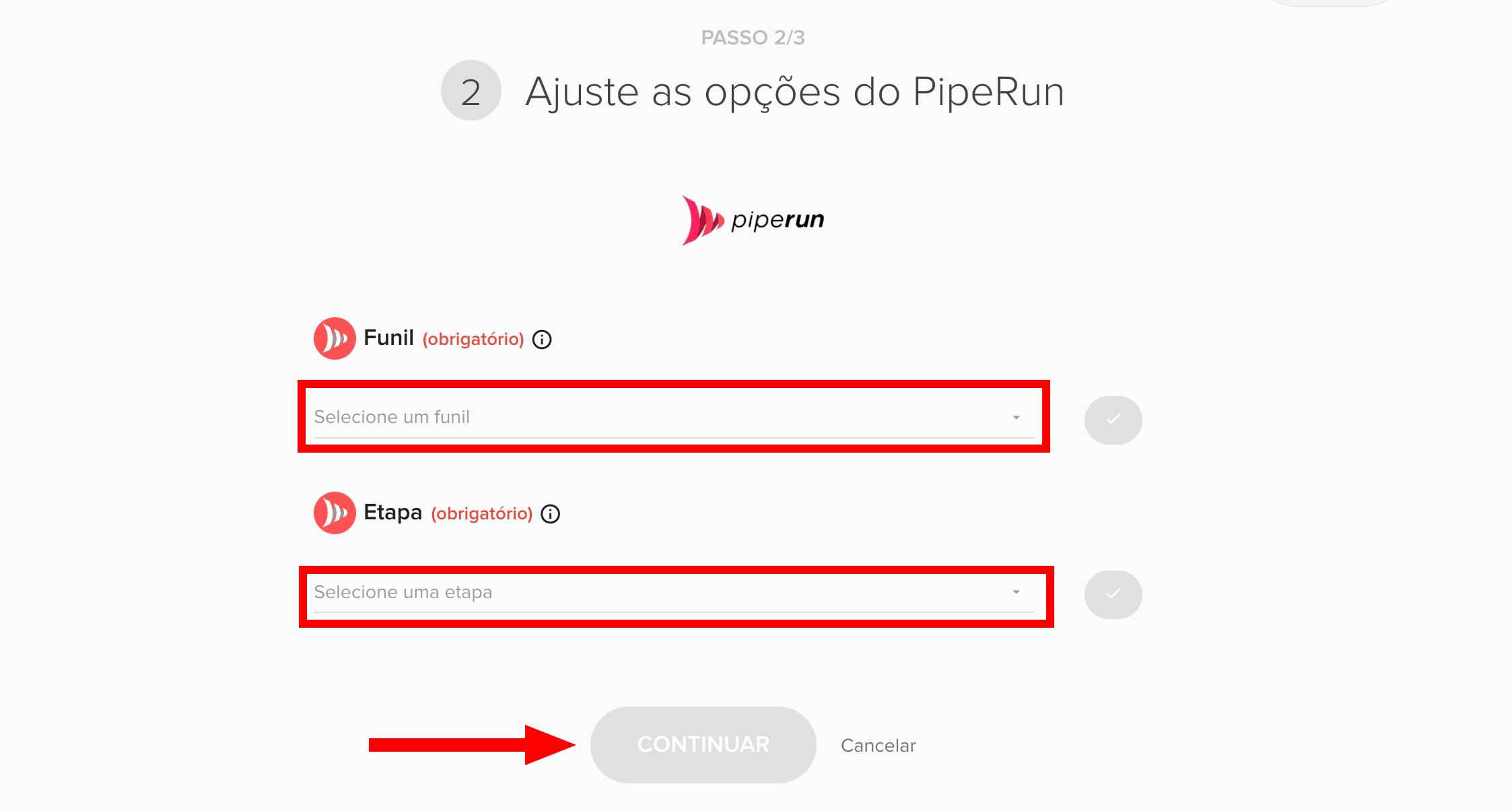 9. Selecione um Funil e Etapa para recebimento dos leads. Ao final, clique em Continuar.