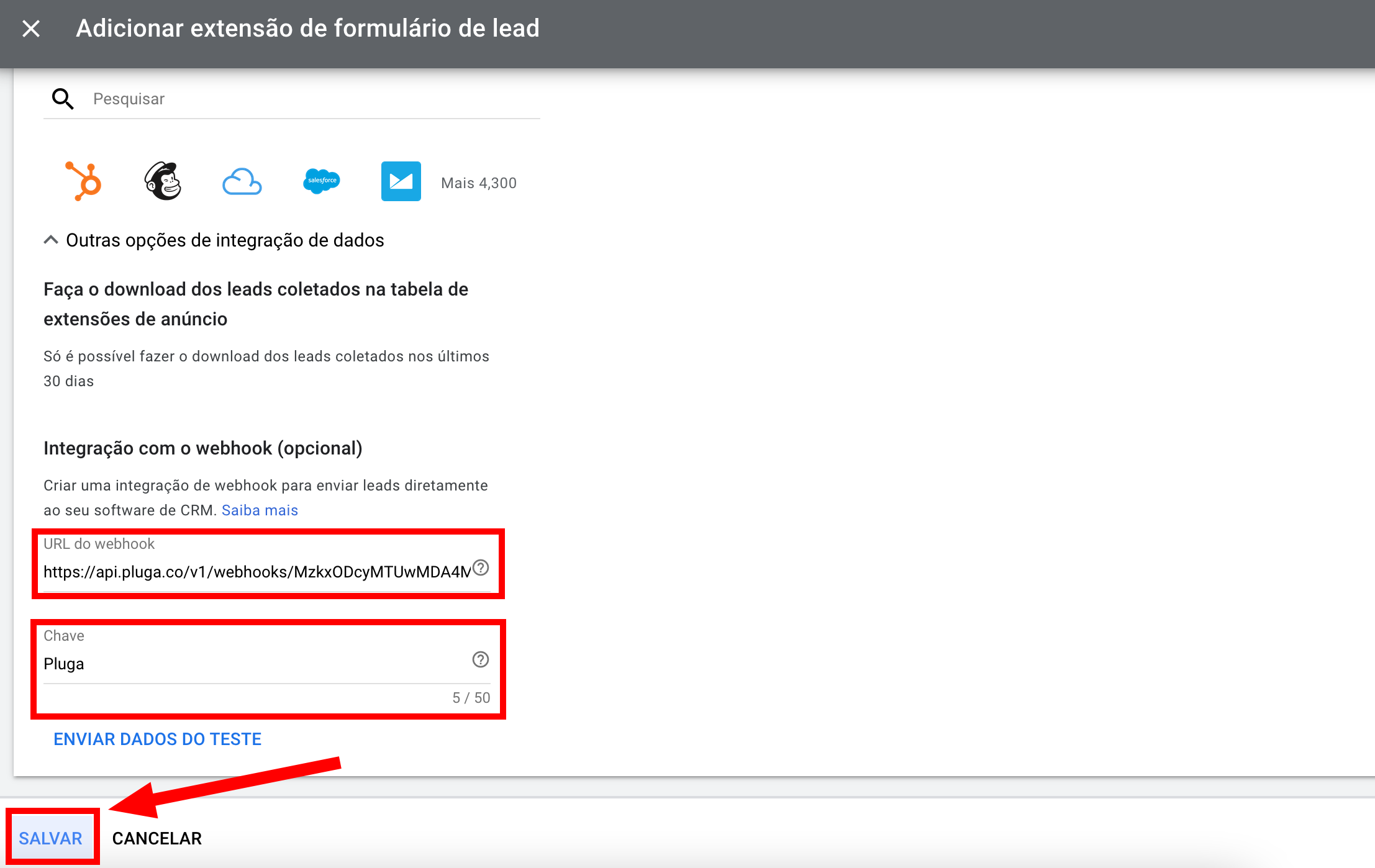 5. Em URL do webhook, cole o URL copiado na etapa 3. Em Chave, digite Pluga.