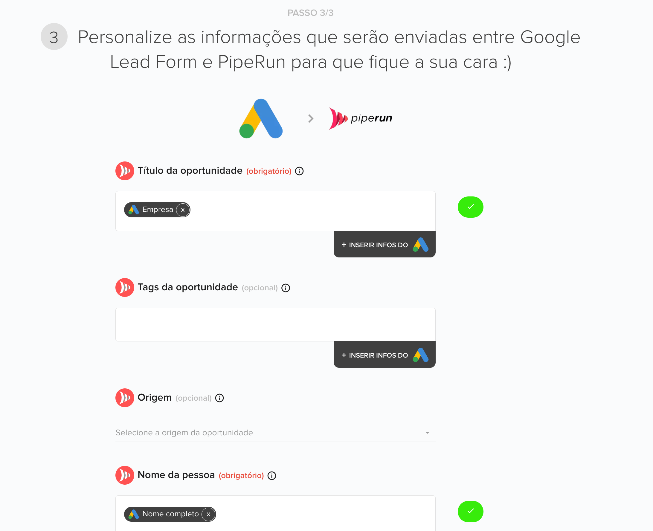 10. Agora, personalize as informações que serão enviadas do Google Lead Form para a conta do PipeRun. Ao final, clique em Finalizar automatização.