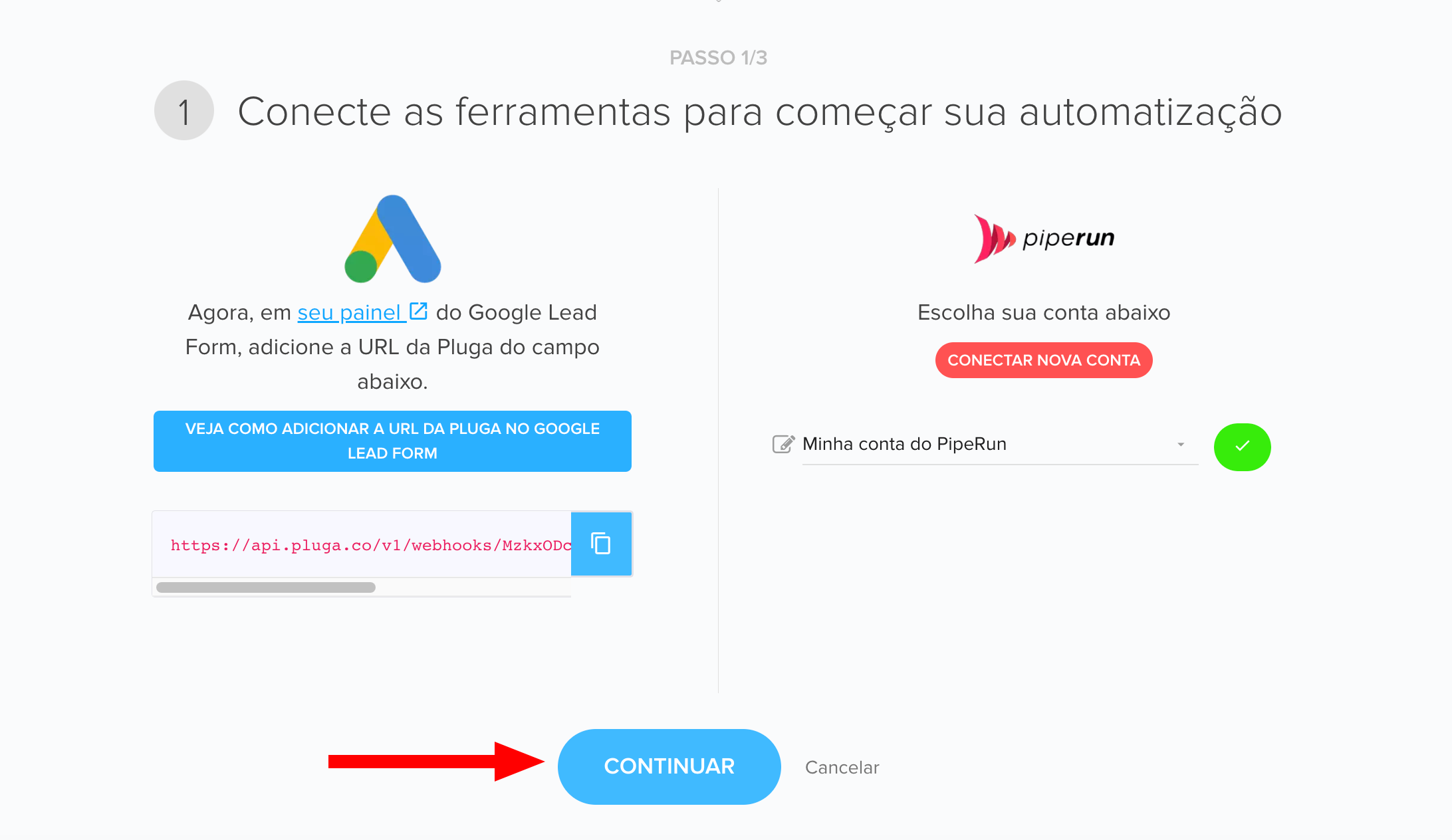 1. Para configurar o envio leads coletados, acesse a página de integração do Google Lead Form com o PipeRun na Pluga e escolha a automatização.