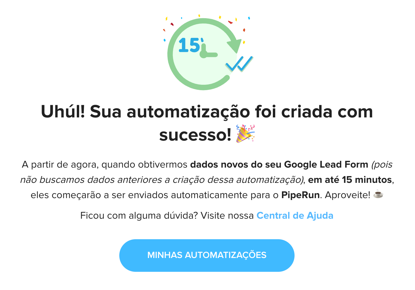 Chegou a hora de configurar o envio dos dados para o PipeRun via Webhook. Mantenha a página do Google Lead Form aberto e prossiga para o próximo tópico.