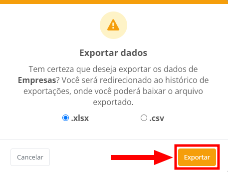 2. Uma janela de confirmação da exportação aparecerá. Existem duas opções de exportação: arquivo no formato .xlsx (1) ou .csv (2). Selecione a desejada e clique em "Exportar".