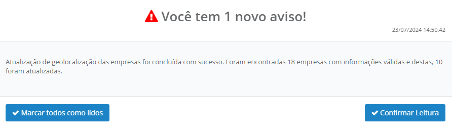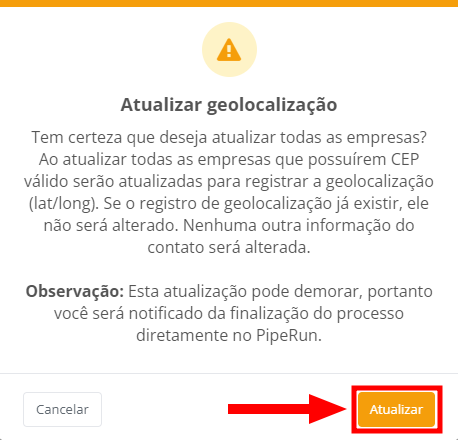 2. Todas as empresas selecionadas que possuírem CEP válido serão atualizadas para registrar a sua geolocalização (latitude/longitude). Clique em "Atualizar" para confirmar.