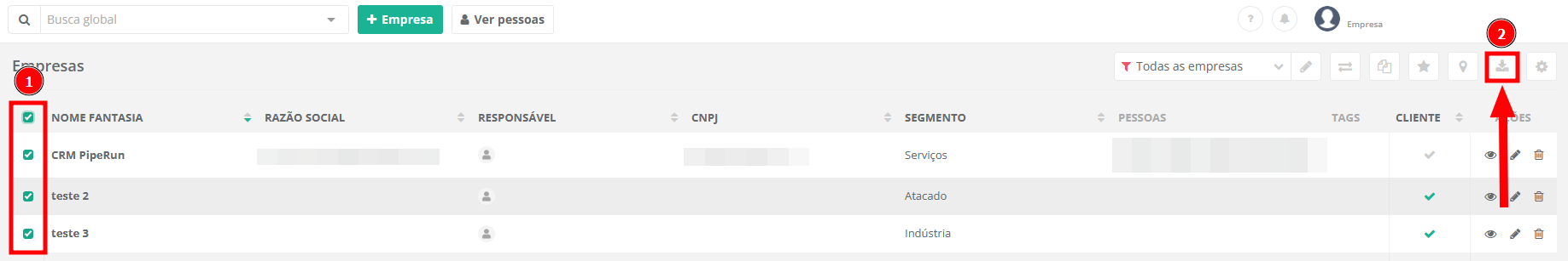 1. Para exportar cadastros, selecione uma ou mais empresas marcando a caixa de seleção (1) e, após, clique em "Exportar empresas" (2).
