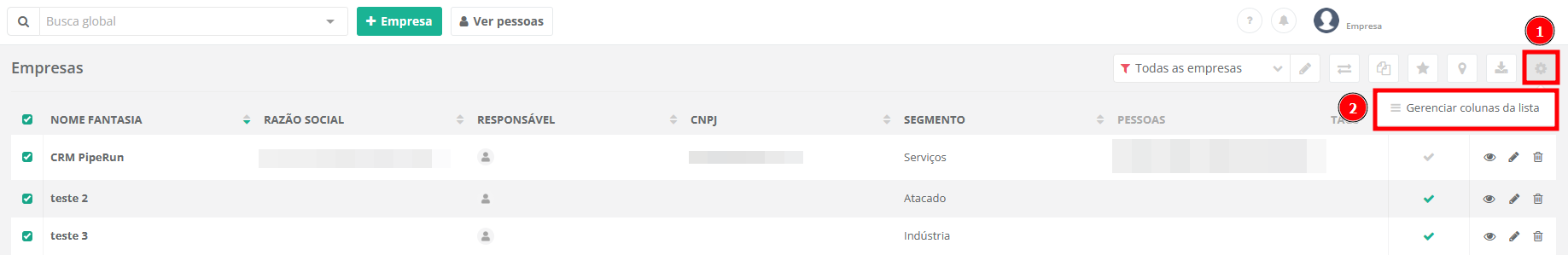 1. Na listagem de empresas, clique em "Outras opções" (1) e, após, em "Gerenciar colunas da lista" (2).
