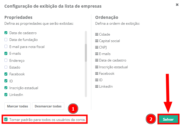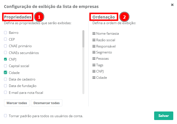 4. Caso deseje que as colunas e ordenações fiquem disponíveis para todos os usuários da conta, marque a opção "Tornar padrão para todos os usuários da conta" (1). Por fim, clique em "Salvar" (2).