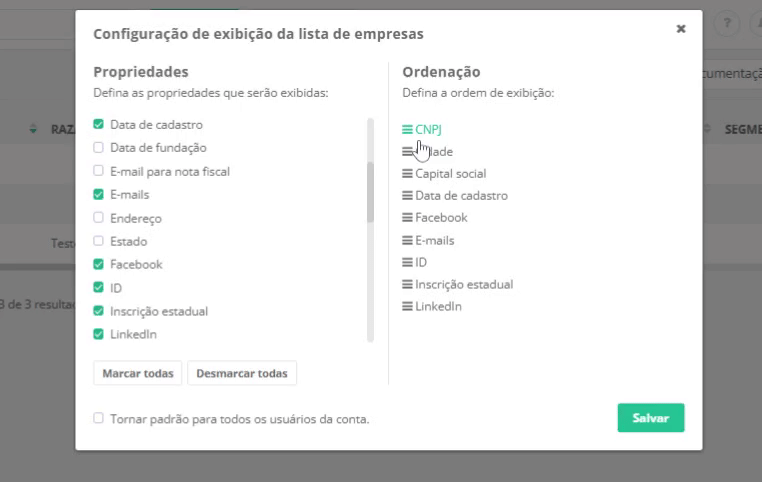 No módulo de empresas é possível personalizar as colunas da lista de exibição, sendo possível escolher quais aparecerão e em qual ordem.