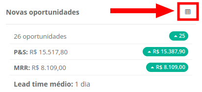 Caso deseje visualizar a listagem das informações detalhadas dos dados exibidos nos blocos, como em novas oportunidades, oportunidades ganhas, perdidas, congeladas, em aberto, empresas e atividades, clique no ícone no canto superior direito do bloco.