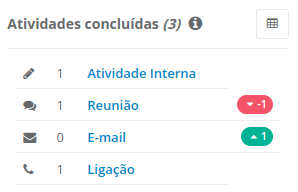 Neste bloco, são exibidas todas as atividades concluídas no período filtrado. É possível visualizar a quantidade por tipos de atividades.