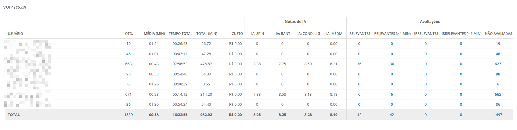 - Relevantes (>1min): total de ligações mais de um minuto que foram marcadas como relevantes;