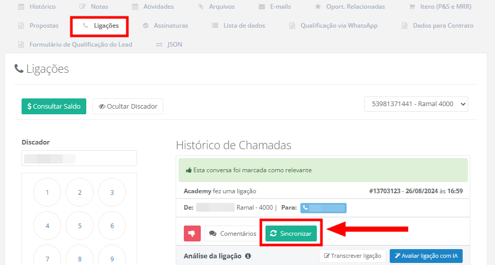 Dica: caso as ligações não sejam contabilizadas no relatório, acesse as oportunidades e na aba "Ligações" clique em "Sincronizar".